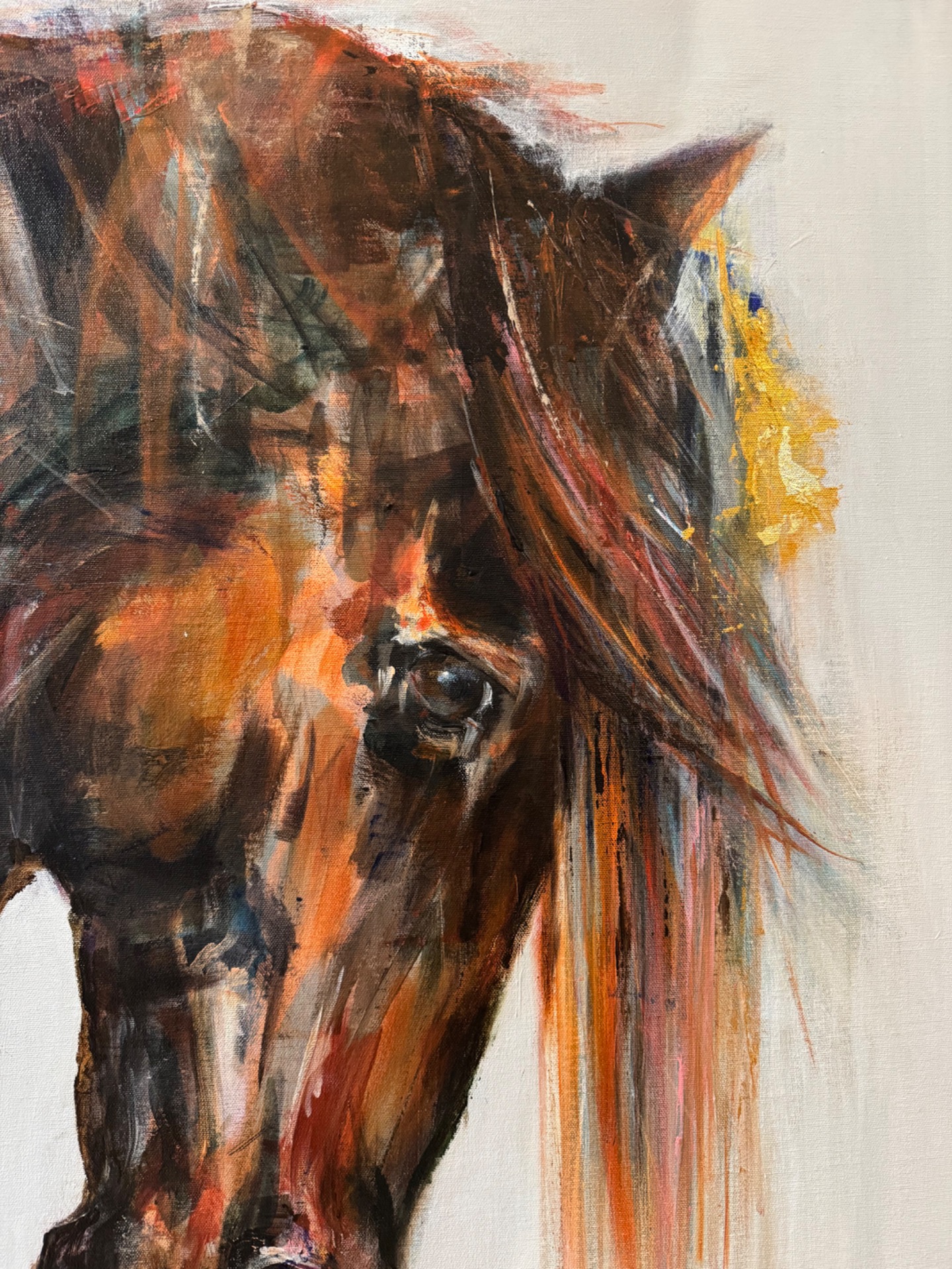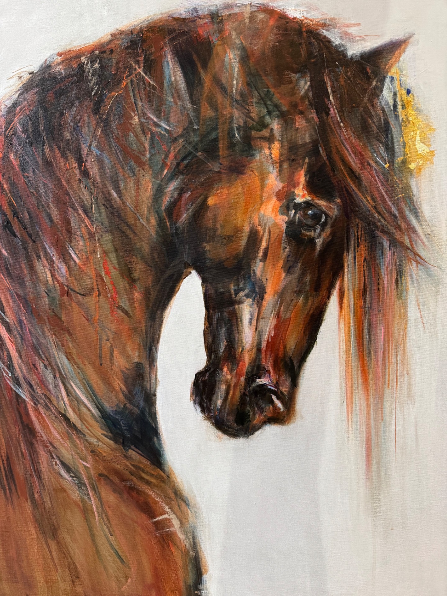Akryylimaalaus + lyöntimetalli 100x 81x 2cm. Reunat on maalattu valkoisella värillä , ja teoksessa on rautalankaripustus.